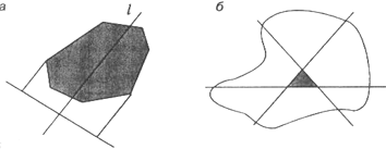 б) Каждая из трех прямых делит площадь данной фигуры пополам. Докажите, что площадь части фигуры, заключенной в треугольнике между тремя прямыми, не превосходит 1/4 всей площади фигуры (показано на рисунке б). |
