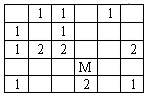 20. | В игре “Сапер” в каждой клетке таблицы стоит либо мина, либо число, которое показывает, сколько мин находится в соседних (по стороне и вершине) с ней клетках. В таблице показано содержимое некоторых клеток (М – мина). Сколько всего мин на поле?